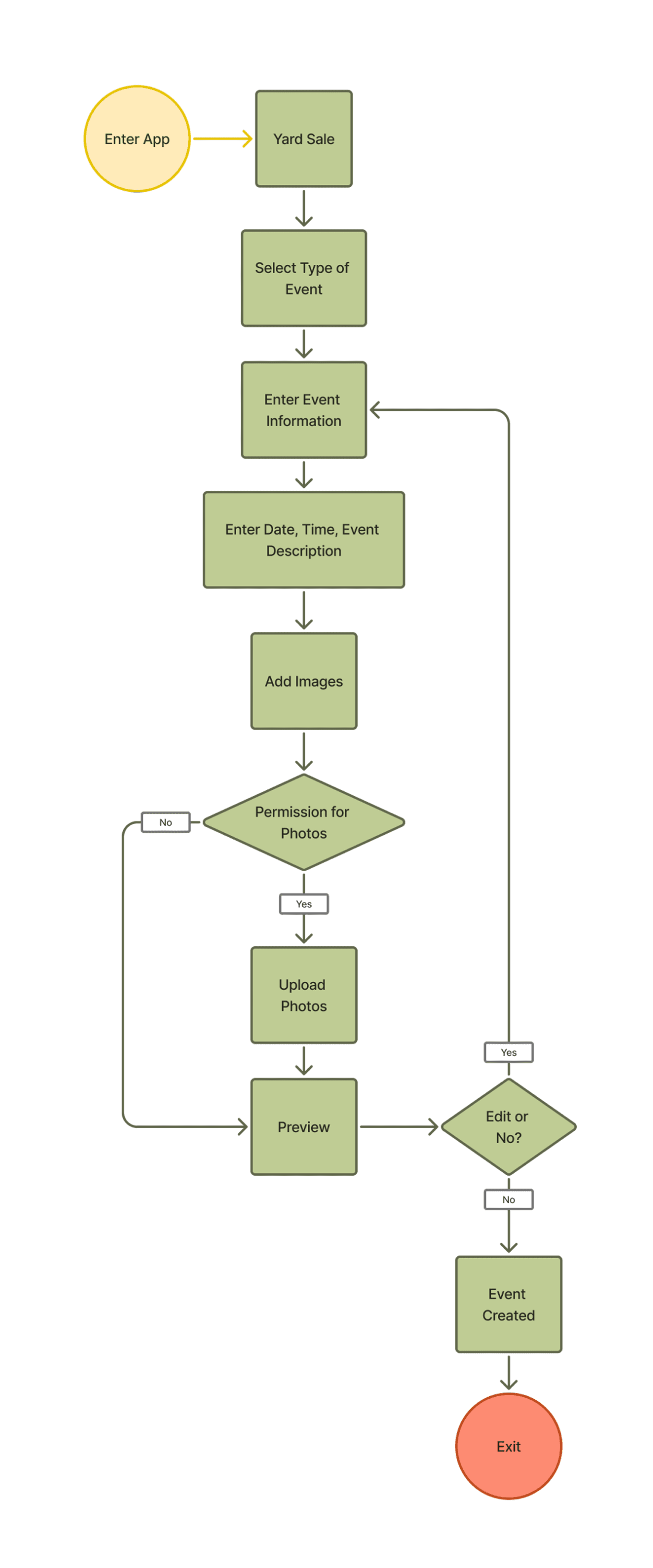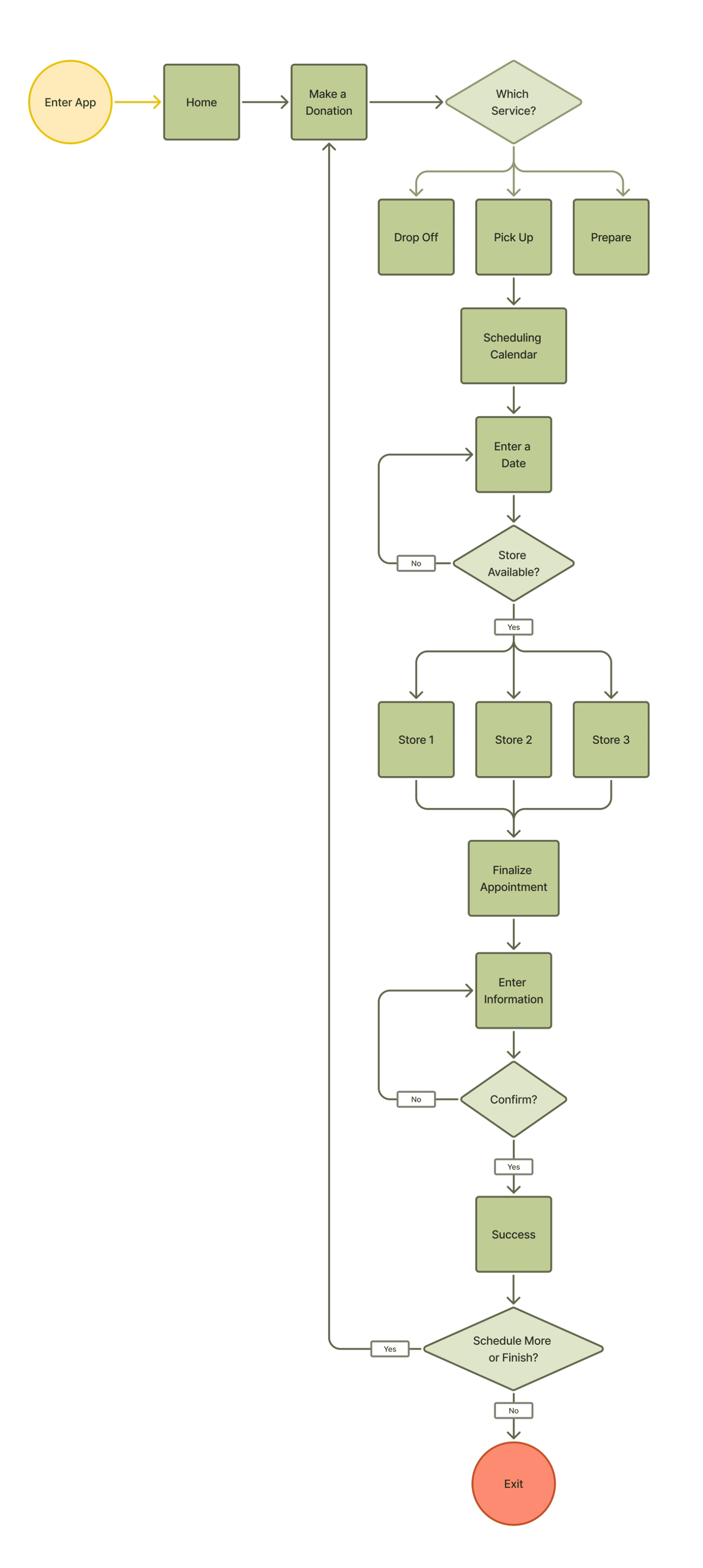 From the three pain points we identified, here are the site maps for the app’s three main features—making donations easier and more convenient while also creating an online space for the yard sale community.