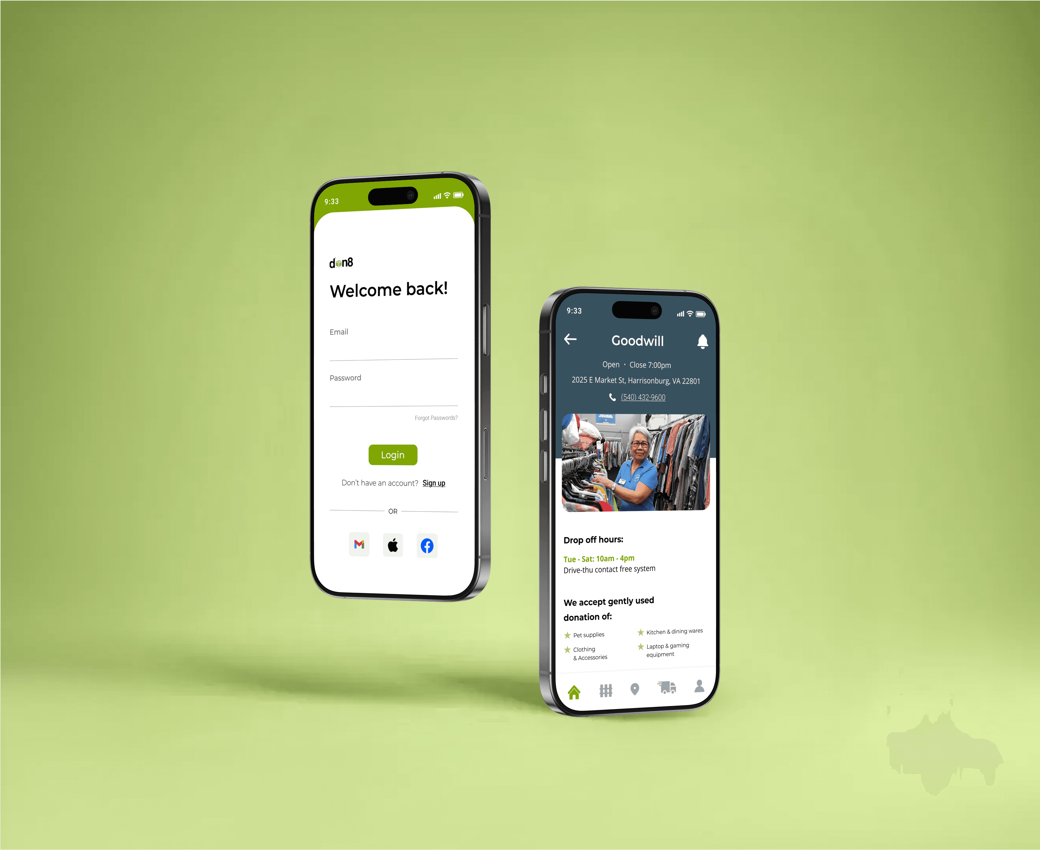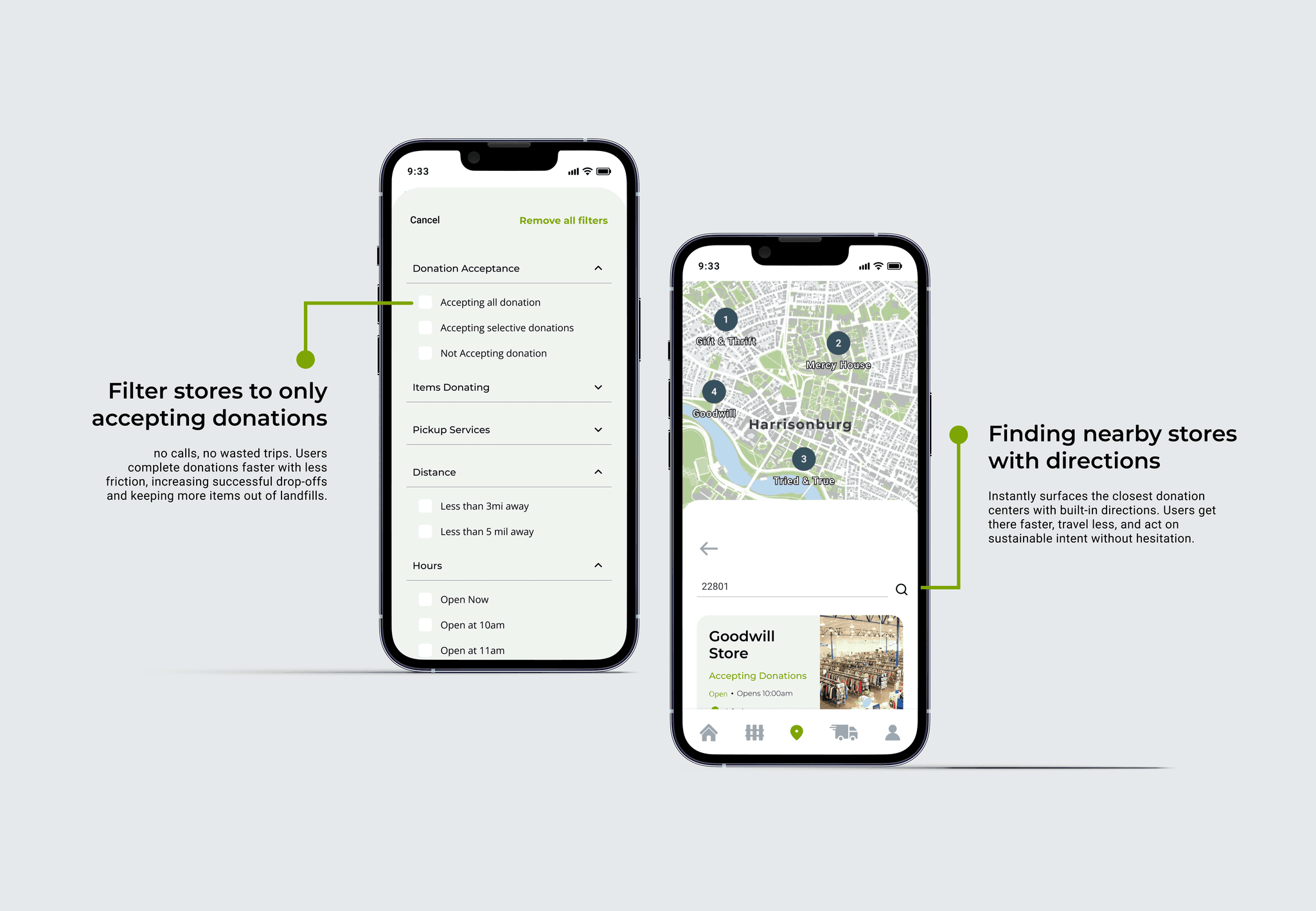 Through online and in-person user and stakeholder interviews, we identified key pain points and designed features such as let users find nearby donation sites, see accepted items, prepare donations, schedule pickups or drop-offs, and discover or promote local yard and estate sales with proximity-based filters.